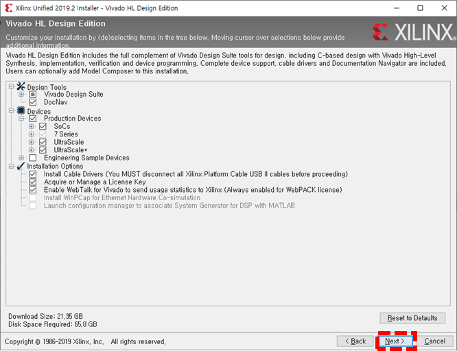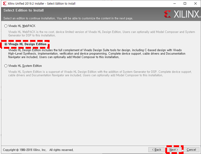 어떤 에디션을 설치 할건지 선택하는 화면이 나오면 Vivado HL Design Edition을 선택한 후 Next 버튼을 클릭한다.