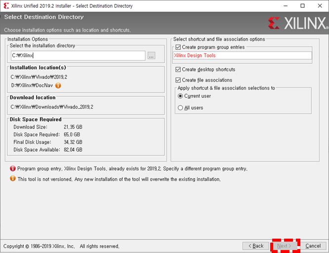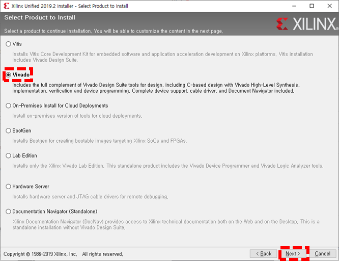 어떤 툴을 설치할지 선택하는 화면이 나오면 Vivado를 선택한 후 Next버튼을 클릭한다.