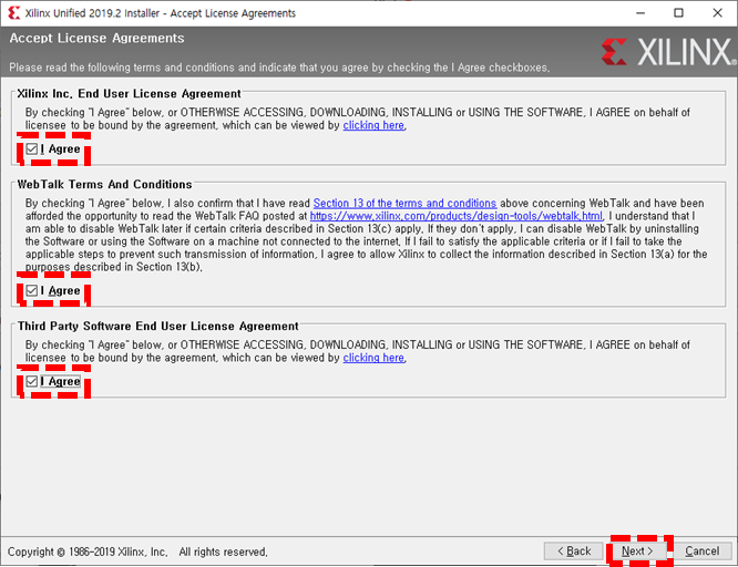 I Agree 체크박스를 모두 선택 후 Next 버튼을 클릭한다.