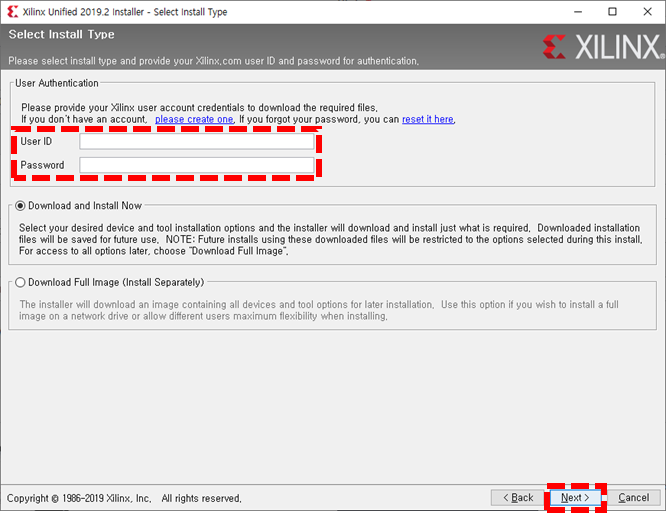 자일링스 유저임을 확인하는 창이 나오면 자일링스 웹페이지에 가입한 ID와 Password를 입력한 후 Next 버튼을 클릭한다.