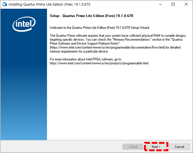 설치 초기화면이 나오면 Next 버튼을 클릭한다.