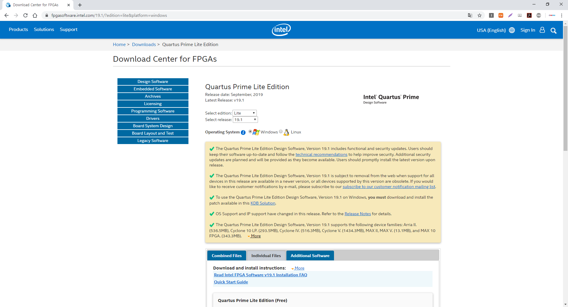 Select edition에서 Lite를 선택하고 Select release는 19.1을 선택하고 아래 탭은 Combined Files 탭을 선택한 후 다운로드 버튼 을 클릭하여 하여 Quartus Lite Edition 19.1을 다운로드 받는다. (※ 3가지 edition에 대한 차이점은 Github에서 다운로드 받은 폴더 안에 data폴더 안에 ss-quartus-comparison.pdf파일을 참고한다.)