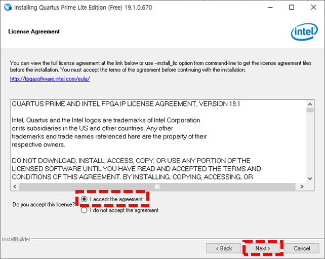 License Agreement 창이 나오면 “I accept the agreement” 라디오버튼을 선택한 후 Next 버튼을 클릭한다.